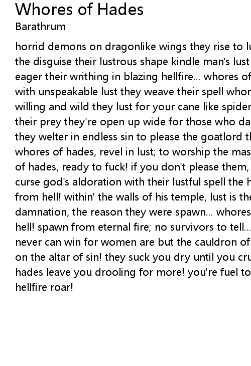 | horrid demons on dragonlike wings they rise to lure all mortals to see through the disguise their lustrous shape kindle man's lust and desire us satan watches eager their writhing in blazing hellfire... whores of hades, bitches from hell with unspeakable lust they weave their spell whores of hades; no need to rape! willing and wild they lust for your cane like spiders in nets, every male is their prey they're open up wide for those who dare stay! in wicked aldoration they welter in endless sin to please the goatlord the dreaded master of man! whores of hades, revel in lust; to worship the master, coming they must! whores of hades, ready to fuck! if you don't please them, they cut off your cock... to curse god's aldoration with their lustful spell the horned master sent them up from hell! within' the walls of his temple, lust is the only law; to weave your damnation, the reason they were spawn... whores of hades, sin for the glory of hell! spawn from eternal fire; no survivors to tell... whores of hades; you never can win for women are but the cauldron of sin! whores of hades sacrifice on the altar of sin! they suck you dry until you crumble to dust! whores of hades leave you drooling for more! you're fuel to the furnace, now hear the hellfire roar! |