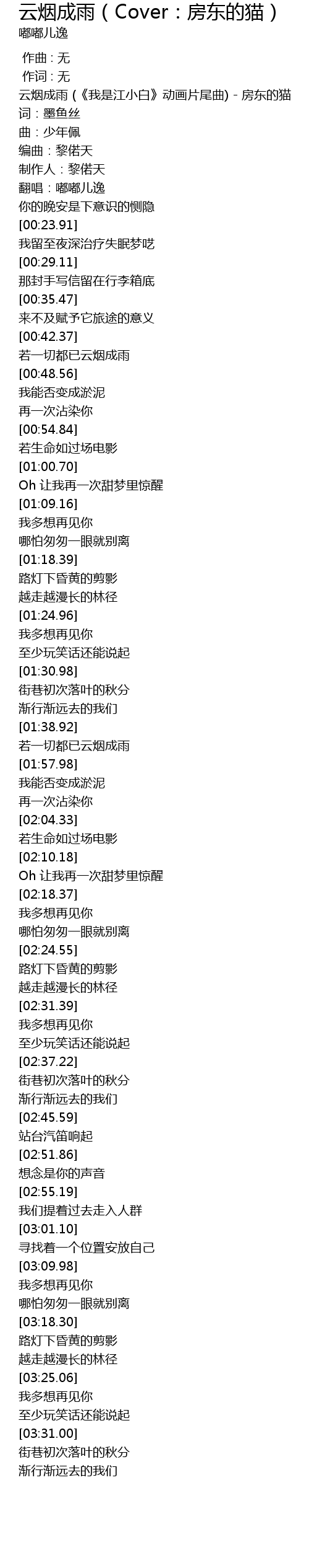 | [00:00.89] | 云烟成雨 (《我是江小白》动画片尾曲) - 房东的猫 |