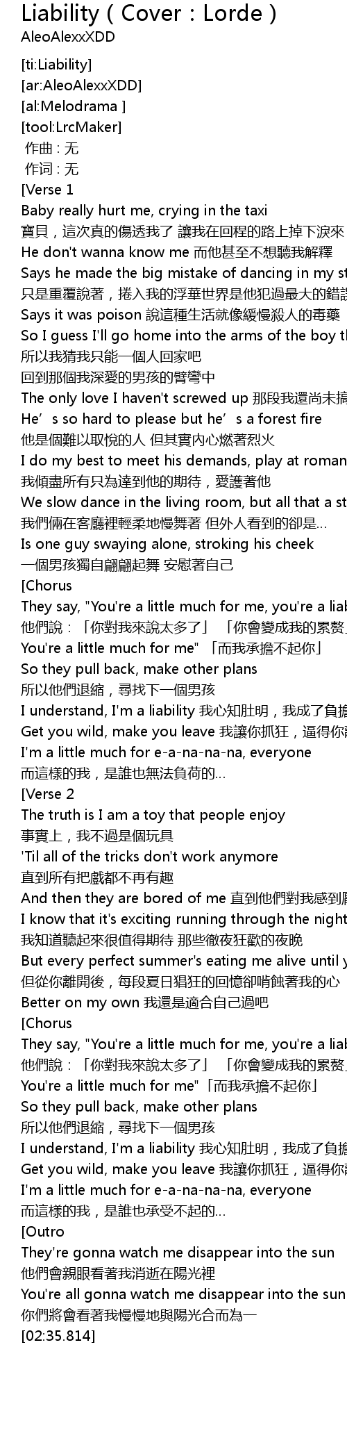 | [01:47.050] | They say, "You're a little much for me, you're a liability 他們說:「你對我來說太多了」 「你會變成我的累赘」 |