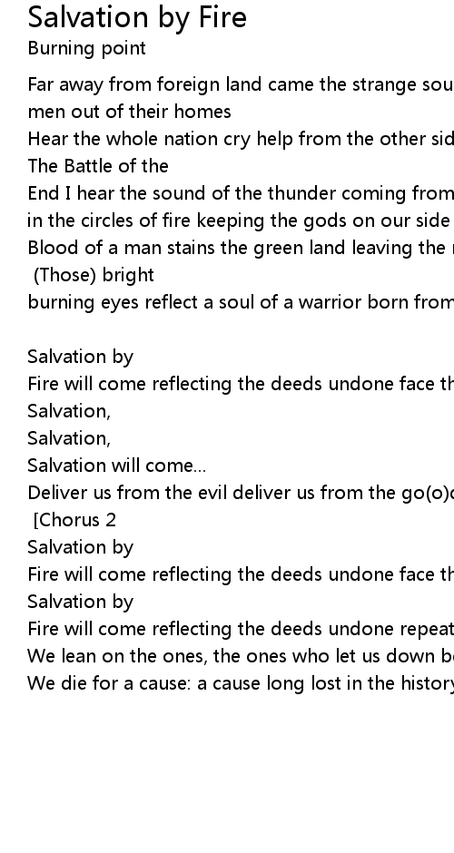 Blood of a man stains the green land leaving the mark of death falling from grace into quicksand it makes you hard to breathe [Pre-chorus] (Those) bright burning eyes reflect a soul of a warrior born from the fire of ancient gods [Chorus] |