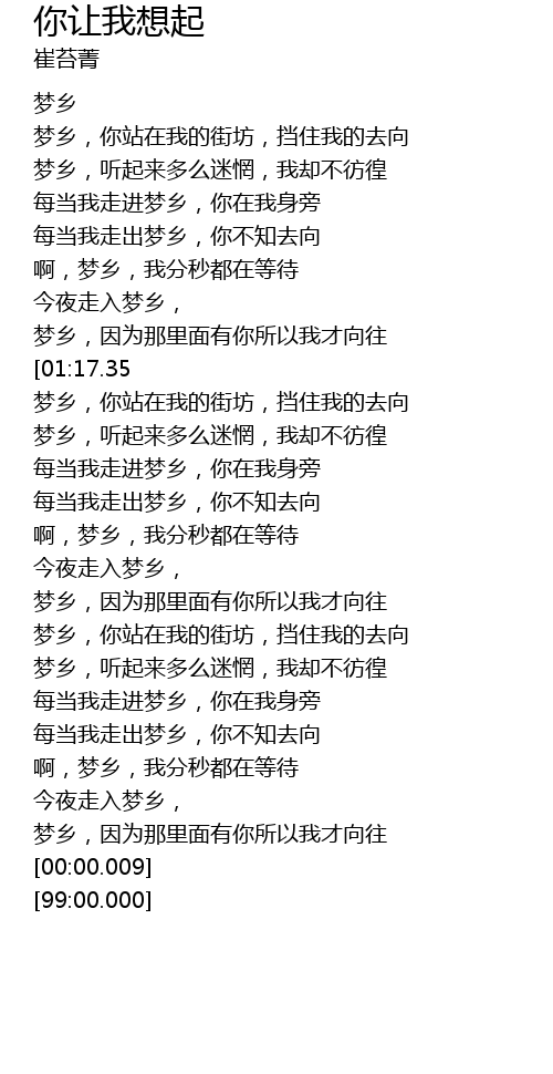 | [01:35.19] | 梦乡,你站在我的街坊,挡住我的去向 |