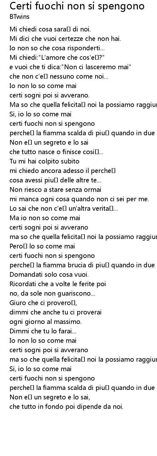 | [02:03.831] | perche la fiamma brucia di piu quando in due l' alimentano... |
