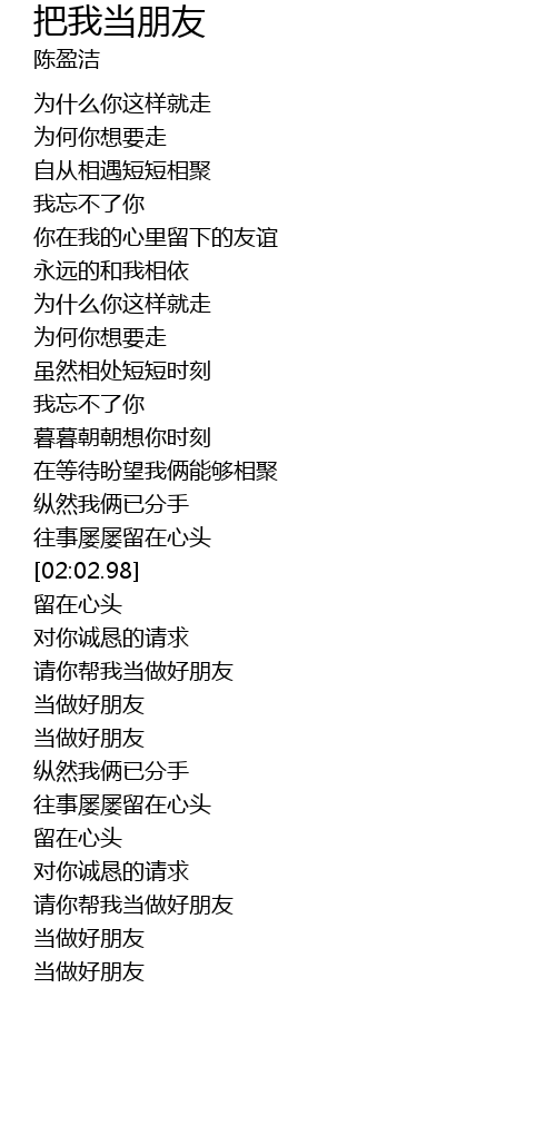 | [02:11.86] | qǐng nǐ bāng wǒ dàng zuò hǎo péng you |