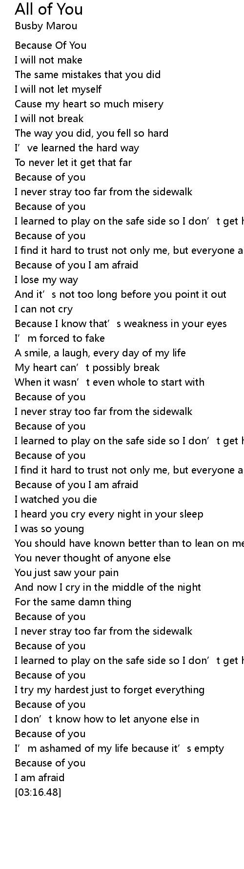 | [00:50.74] | I learned to play on the safe side so I don’t get hurt |