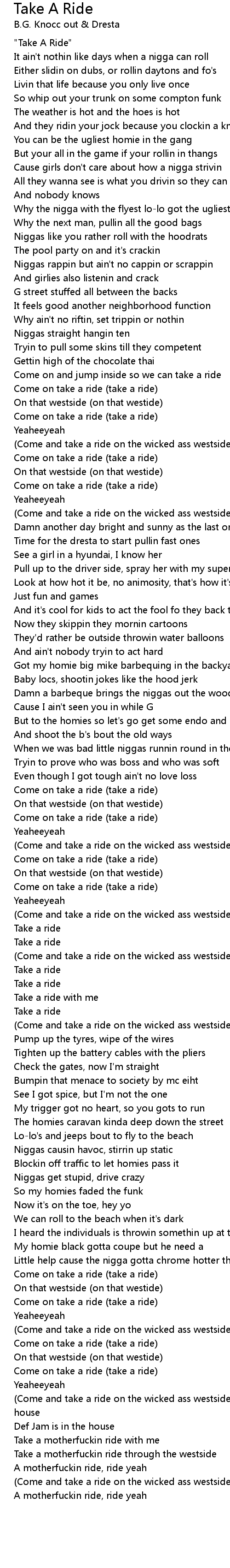 (Come and take a ride on the wicked ass westside)Take a ride |