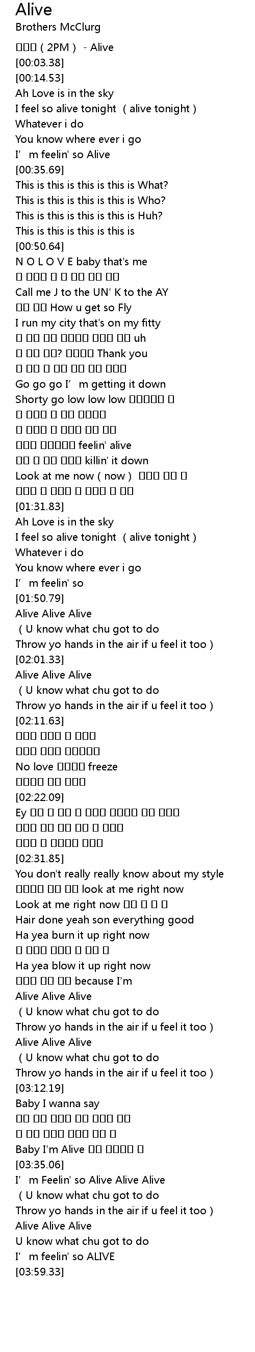 | [03:35.61] | I' m Feelin' so Alive Alive Alive |