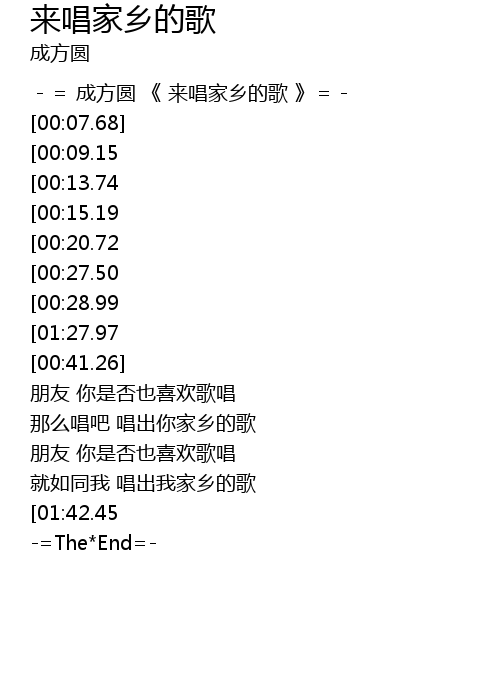 | [00:02.99] | -= 成方圆 《 来唱家乡的歌 》=- |