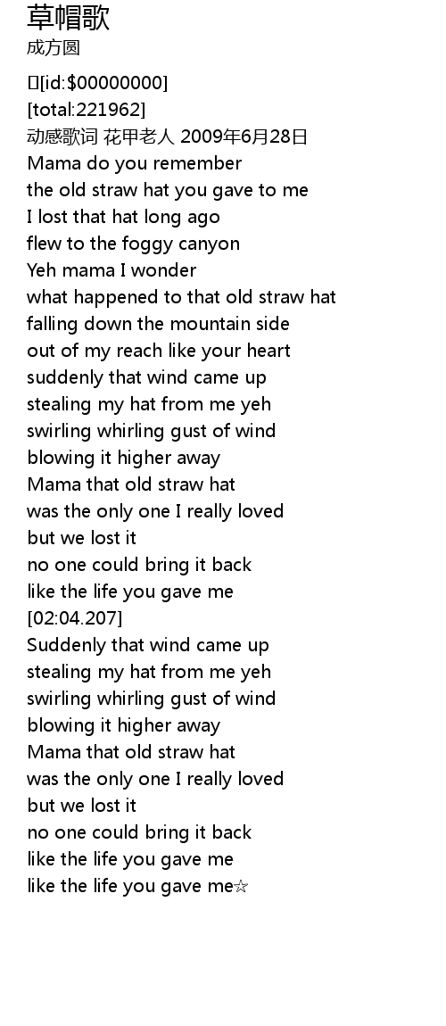| [00:01.944] | dòng gǎn gē cí huā jiǎ lǎo rén 2009 nián 6 yuè 28 rì |