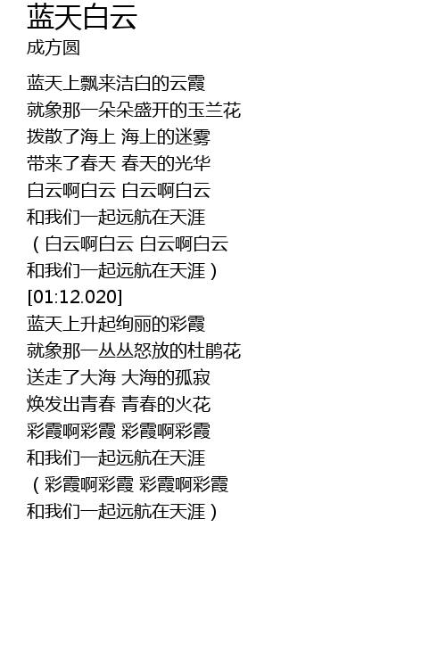 | [00:15.520] | 蓝天上飘来洁白的云霞 |