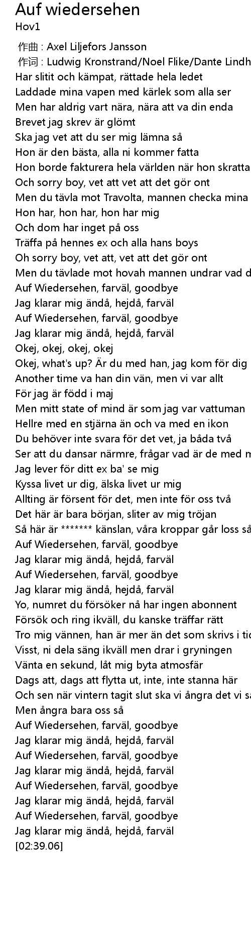 | [01:36.55] | Auf Wiedersehen, farväl, goodbye |