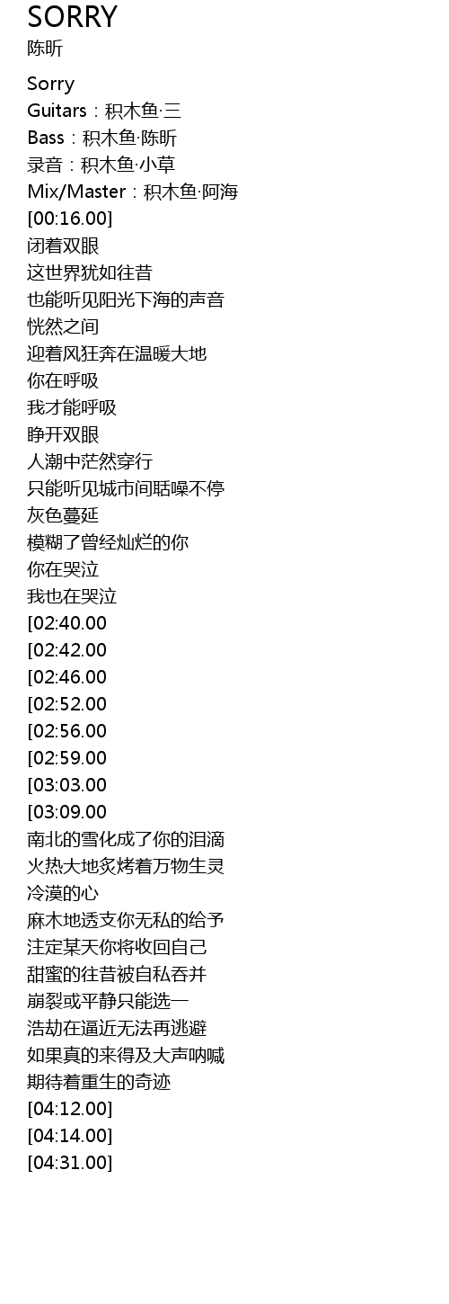 | [01:28.00][02:40.00][03:31.00] | Sorry |
