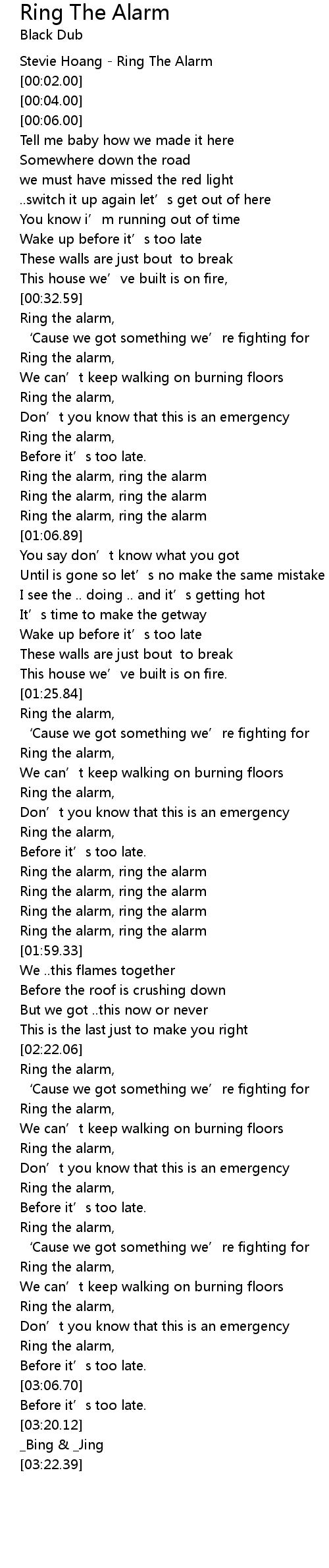 | [00:00.00] | Stevie Hoang - Ring The Alarm |