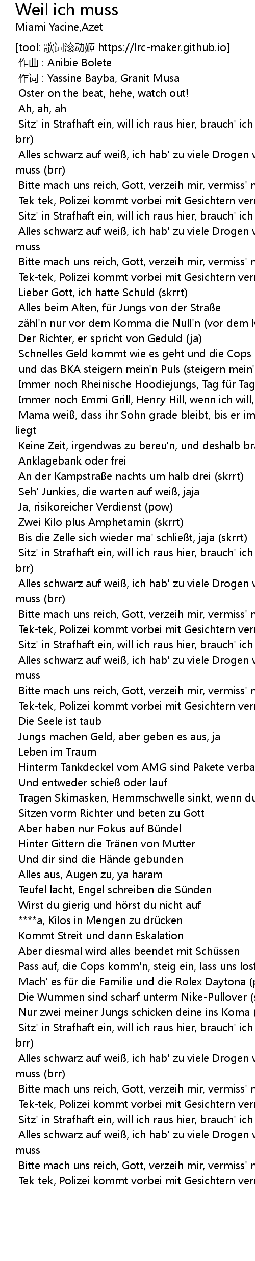 | [02:52.226] | Alles schwarz auf wei, ich hab' zu viele Drogen verkauft, weil ich muss brr |