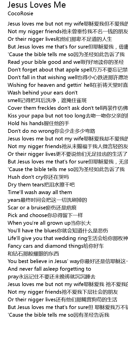 | [02:38.00] | Jesus loves me but not my wife耶稣爱我 祂不爱我的妻子 |