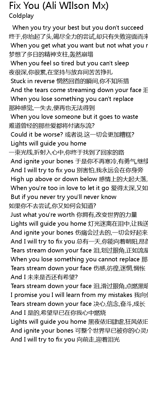 | And I will try to fix you xiàng qián zǒu, yíng zhe lèi guāng |