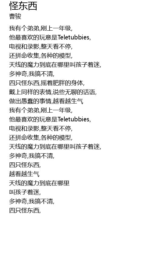 | [00:21.49] | 他最喜欢的玩意是Teletubbies, |