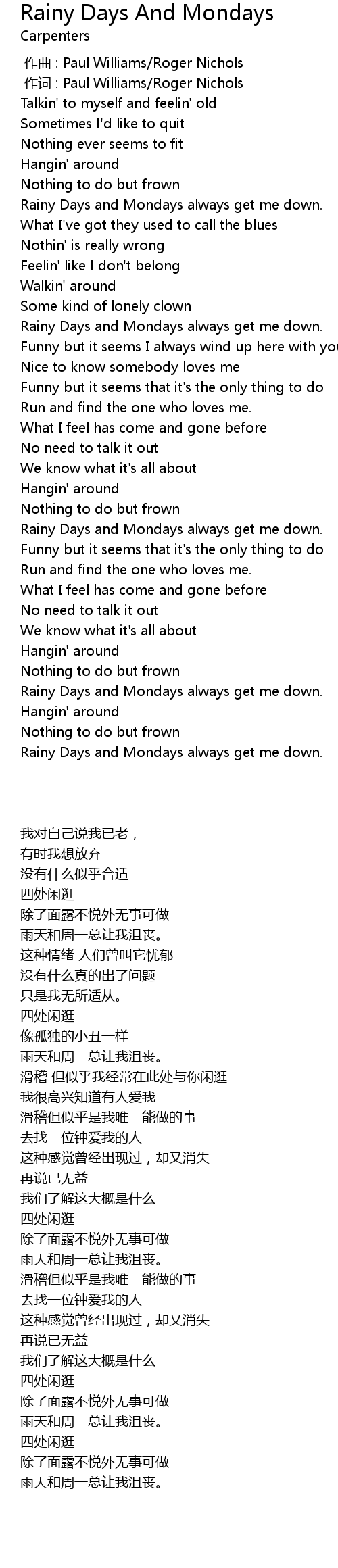 | [00:38.990] | Rainy Days and Mondays always get me down. |