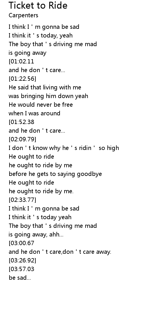 | [01:09.70][01:02.11][00:56.92] | He's got a ticket to ride |