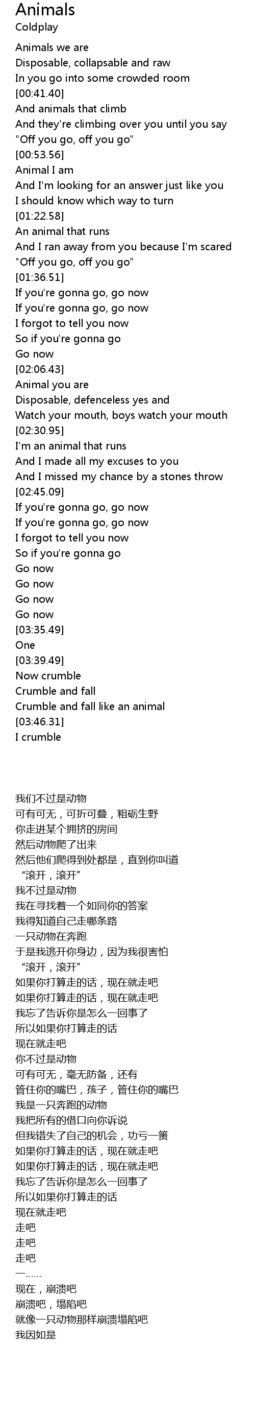 | [03:43.29] | Crumble and fall like an animal |