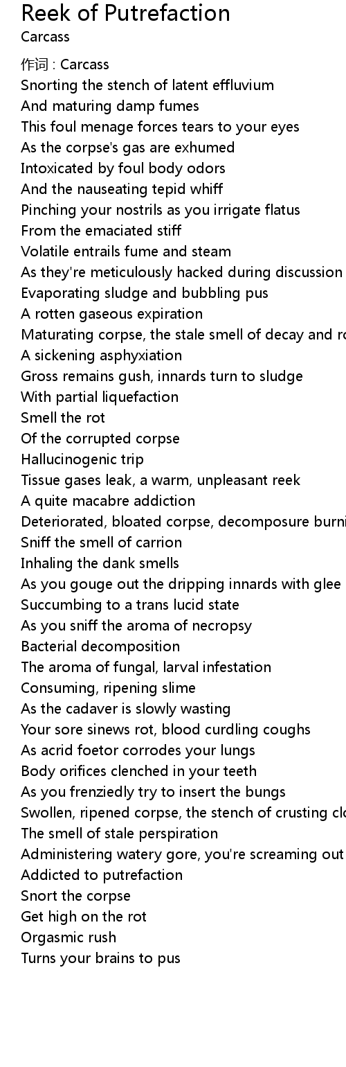 | Swollen, ripened corpse, the stench of crusting clots | |