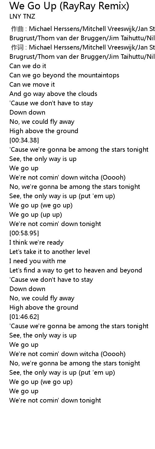 | [02:03.62] | See, the only way is up (put 'em up) |