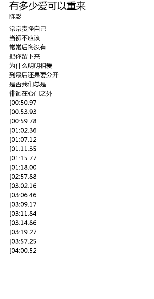 | [03:49.11][03:14.86][01:41.02] | 有多少爱可以重来 |
