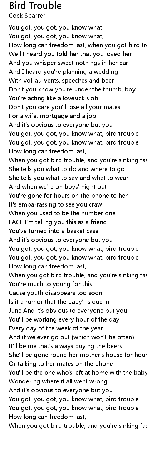 | [3x] | When you got bird trouble, and you' re sinking fast |