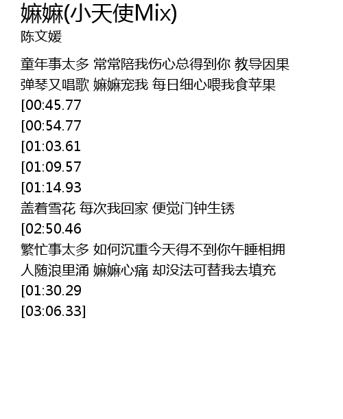 | [00:34.60] | 弹琴又唱歌 嫲嫲宠我 每日细心喂我食苹果 |