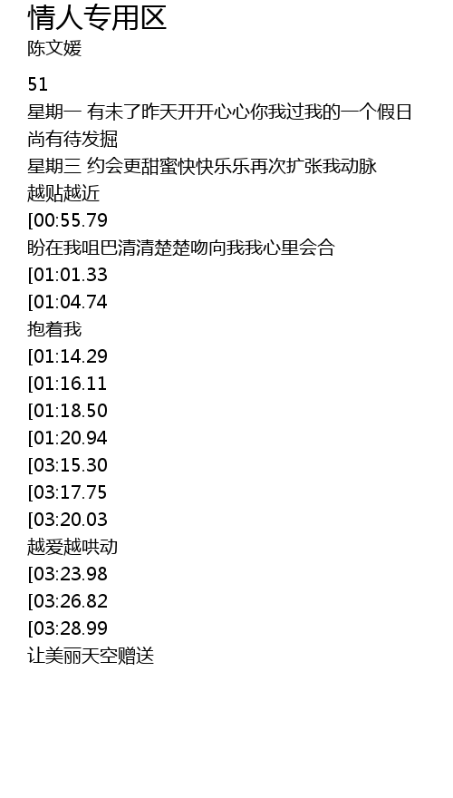 | [01:50.50][00:55.79] | 周末天 盼在我咀巴清清楚楚吻向我我心里会合 |