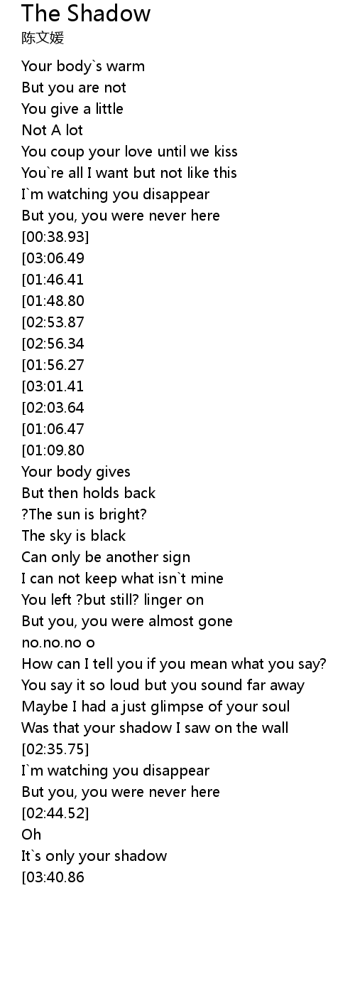 | [03:11.34][03:06.49][02:46.43][01:44.01][00:41.52] | It`s only your shadow |