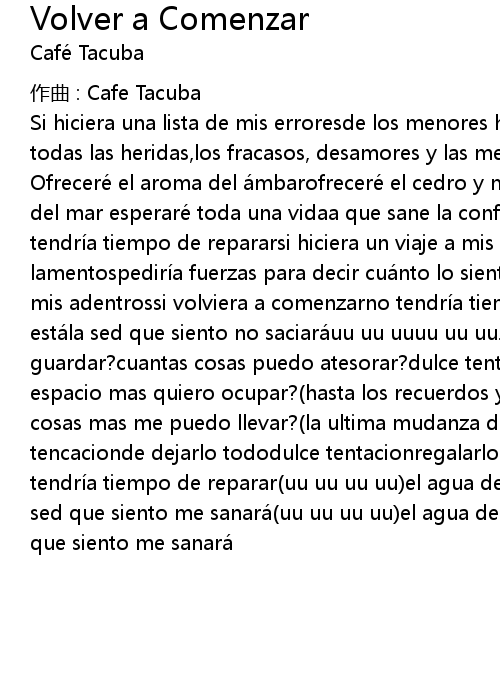 | Ofrecere el aroma del a mbarofrecere el cedro y mis la grimascon la paciencia del mar esperare toda una vidaa que sane la confianzasi volviera a comenzarno tendri a tiempo de repararsi hiciera un viaje a mis adentrosy sobreviviera a los lamentospediri a fuerzas para decir cua nto lo sientosi volviera de un viaje a mis adentrossi volviera a comenzarno tendri a tiempo de repararel agua derramada esta la sed que siento no saciara uu uu uuuu uu uu... cuantas cosas mas puedo guardar? cuantas cosas puedo atesorar? dulce tentacio nde dejarlo todocuantas espacio mas quiero ocupar? hasta los recuerdos ya no caben en este lugar cuantas cosas mas me puedo llevar? la ultima mudanza debe ser la mas ligera dulce tencacionde dejarlo tododulce tentacionregalarlo todosi volviera a comenzarno tendri a tiempo de reparar uu uu uu uu el agua derramada esta uu uu uu uu la sed que siento me sanara uu uu uu uu el agua derramada esta uu uu uu uu la sed que siento me sanara |