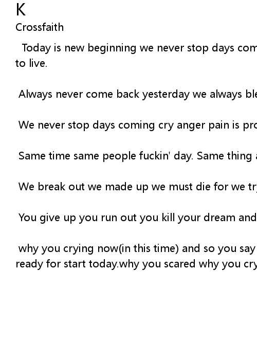 why you crying now(in this time) and so you say are you believe myself are you ready for start today.why you scared why you cry I feel let you down. |