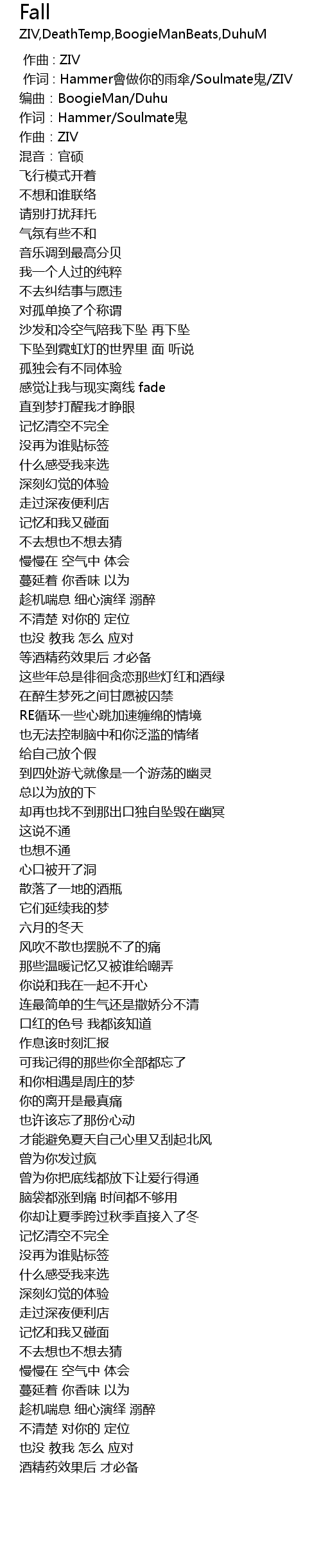 | [00:01.000] | 作词 : Hammer會做你的雨傘/Soulmate鬼/ZIV |