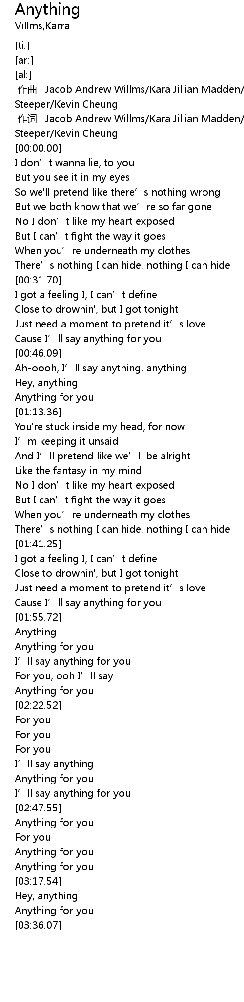 | [00:00.000] | 作词 : Jacob Andrew Willms/Kara Jiliian Madden/Matthew T Steeper/Kevin Cheung |