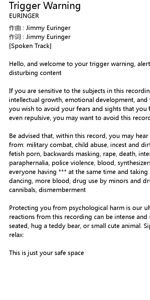 | Hello, and welcome to your trigger warning, alerting you to potentially disturbing content | |