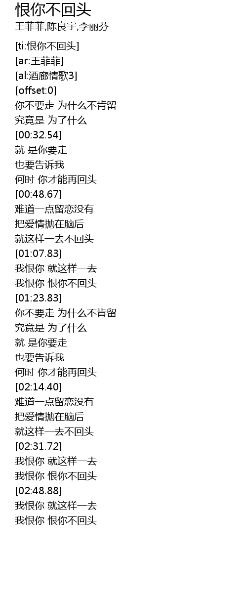 | [02:40.88] | wǒ hèn nǐ hèn nǐ bù huí tóu |