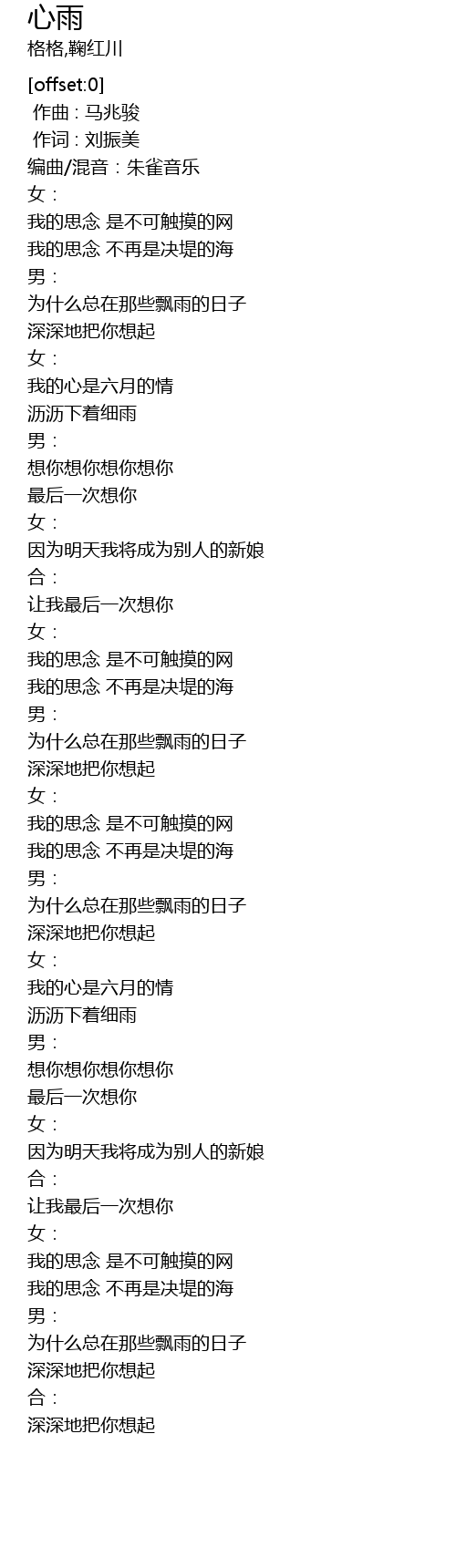 | [00:06.99] | 编曲/混音:朱雀音乐 |