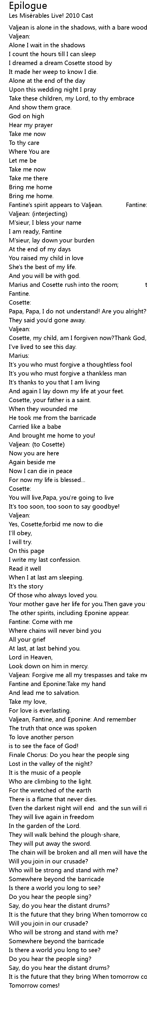 Valjean: Forgive me all my trespasses and take me to your glory. |