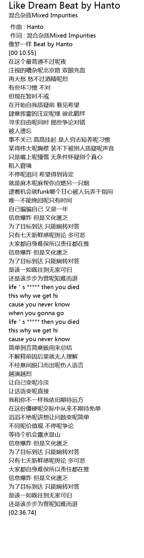 | [00:01.000] | 作词 : 混合杂质Mixed Impurities |