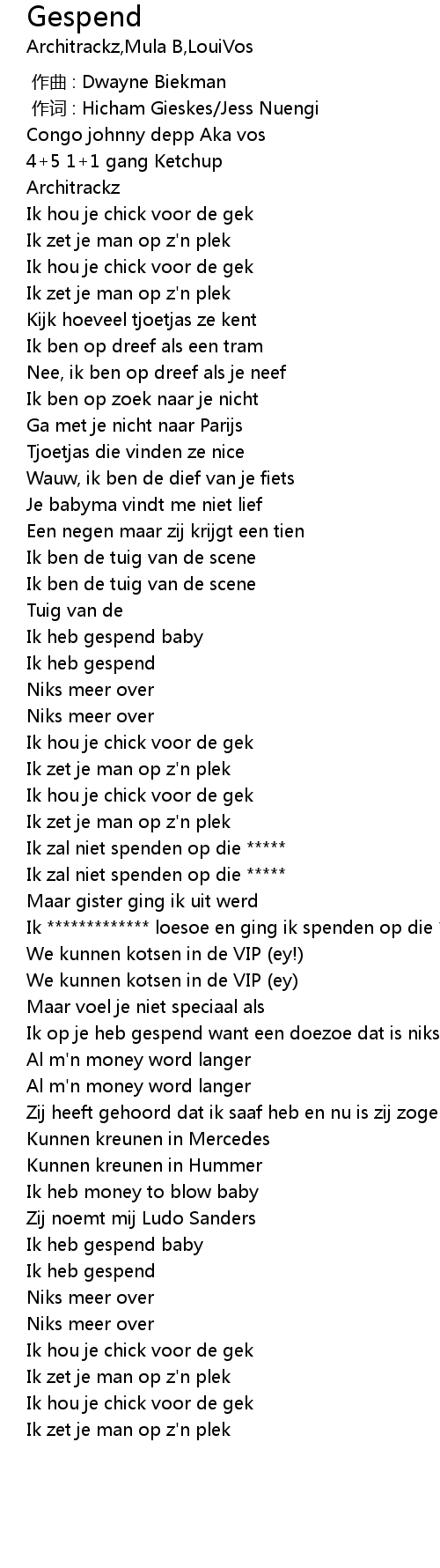 | [01:10.93] | Ik ************* loesoe en ging ik spenden op die ***** |