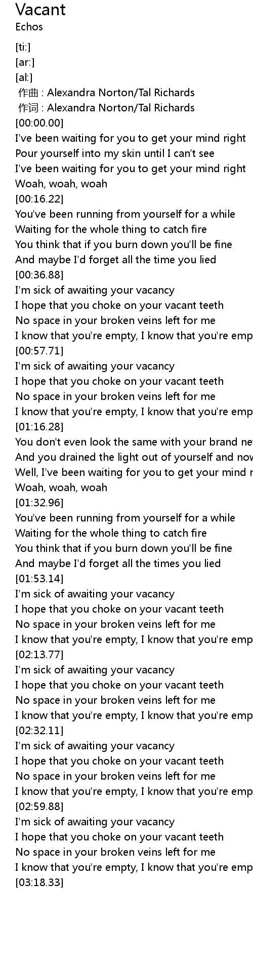 | [03:00.05] | I'm sick of awaiting your vacancy |