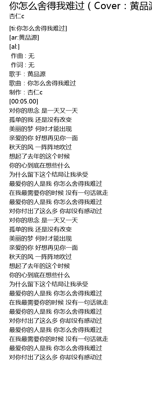 | [00:02.00] | 歌曲:你怎么舍得我难过 |