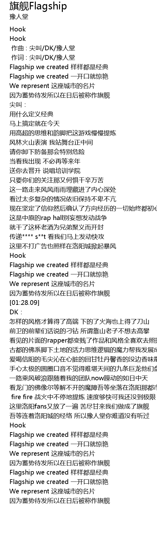 | [01:17.51] | Flagship we created yī kāi kǒu jiù jīng yàn |