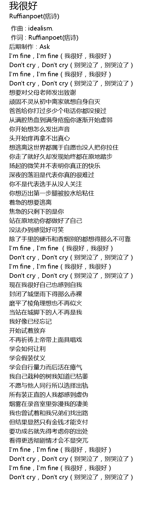 | [00:24.74] | I' m fine, I' m fine wo hen hao, wo hen hao |