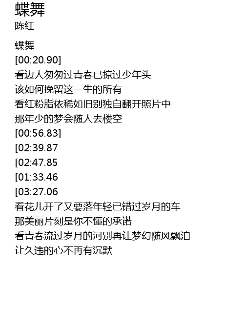 | [03:14.67][01:33.46] | 蝶舞是真实是梦幻是追逐 |
