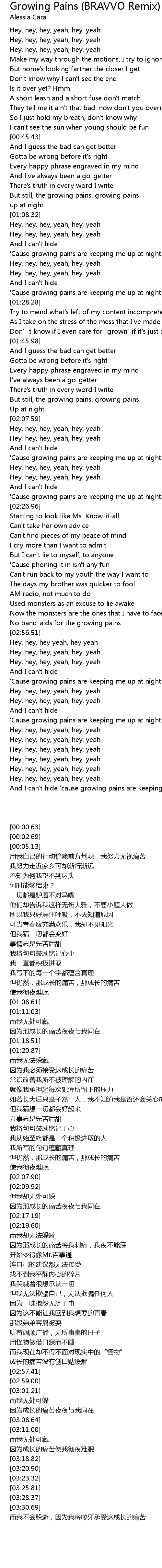 | [03:32.21] | And I can' t hide ' cause growing pains are keeping me up at night |