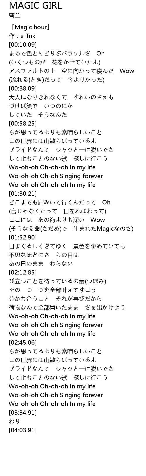 | [03:21.37] | Wo-oh-oh Oh-oh-oh In my life |