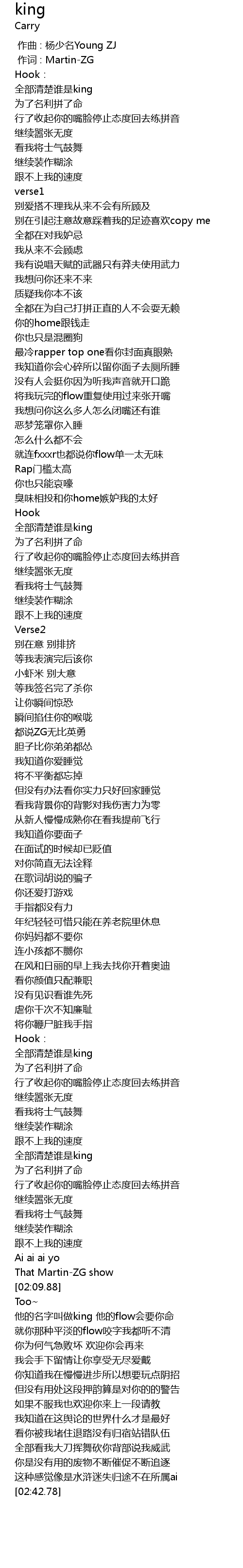 | [02:13.42] | tā de míng zì jiào zuò king tā de flow huì yào nǐ mìng |