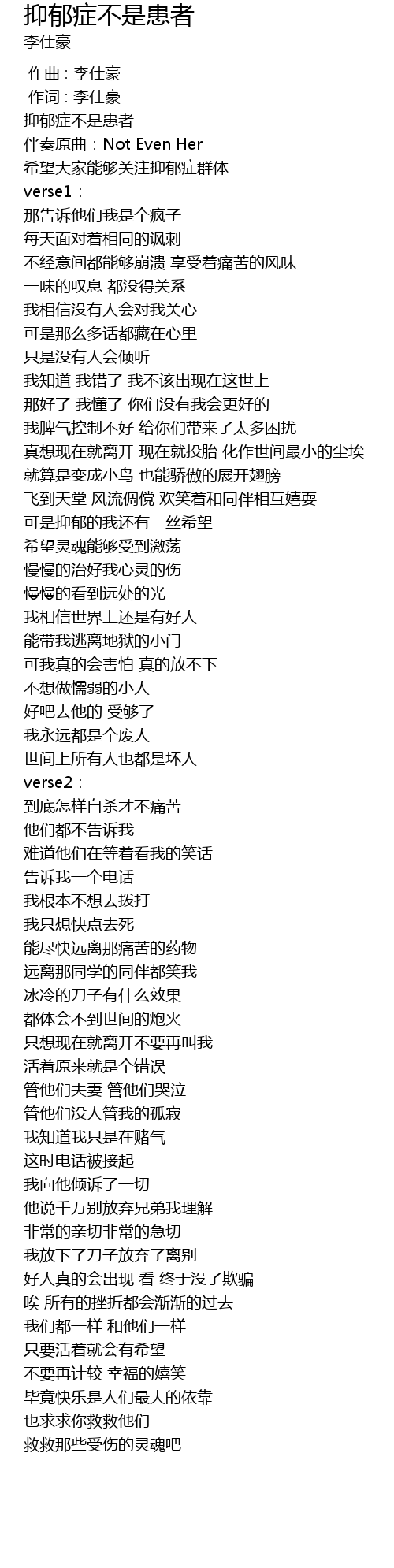 | [00:05.875] | 希望大家能够关注抑郁症群体 |