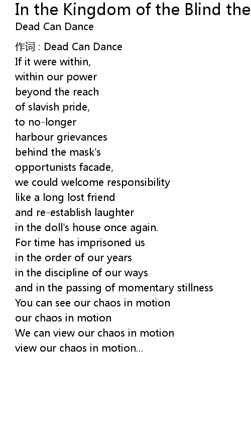 | Song | In the Kingdom of the Blind the One-Eyed Are Kings |